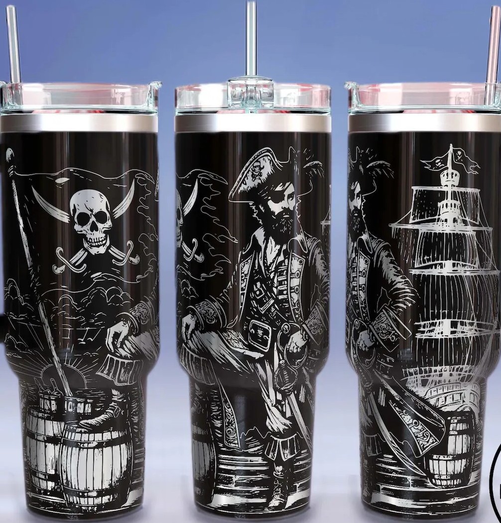 Bring adventure to every sip with this professional laser-engraved YETI Rambler. Wrapped in an intricately detailed pirate design, this tumbler tells a story from every angle: a fierce pirate captain with cutlass in hand, a towering ship with full sails, barrels of treasure, and the iconic skull and crossbones flag waving high.